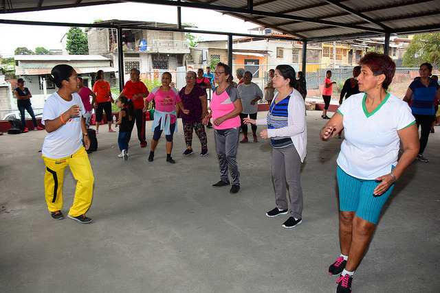Paula Bravo, beneficiaria de sesenta y tres años de edad, participa en las jornadas de bailoterapia que se brindan de manera gratuita en la cooperativa de vivienda Juan Montalvo, ubicada al norte de Guayaquil, guiada bajo la mirada atenta de Johanna Villalta, instructora de la Coordinación Zonal 5 del Deporte y la práctica de actividad física ha marcado una diferencia en su estilo de vida.