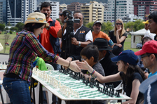 Niños, jóvenes y adultos se sentaron frente a los tableros dispuestos en la Cruz del Papa para jugar ante la nueva Gran Maestra, entre ellos uno de sus alumnos, Sebastián Villamar de 12 años, a quien le da clases de ajedrez por internet y no quiso perder la oportunidad de decirle cuánto la admira.