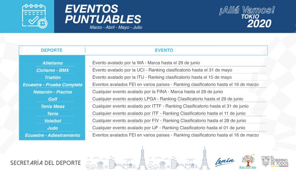 Así mismo, habrá fechas para disputar en eventos puntuables al ranking, otra vía para obtener un cupo a Tokio. Atletismo, ciclismo, triatlón, ecuestres, natación, golf, tenis de mesa, tenis, voleibol y judo, intentarán por esta forma en los eventos avalados por las federaciones internacionales hasta las fechas previstas.