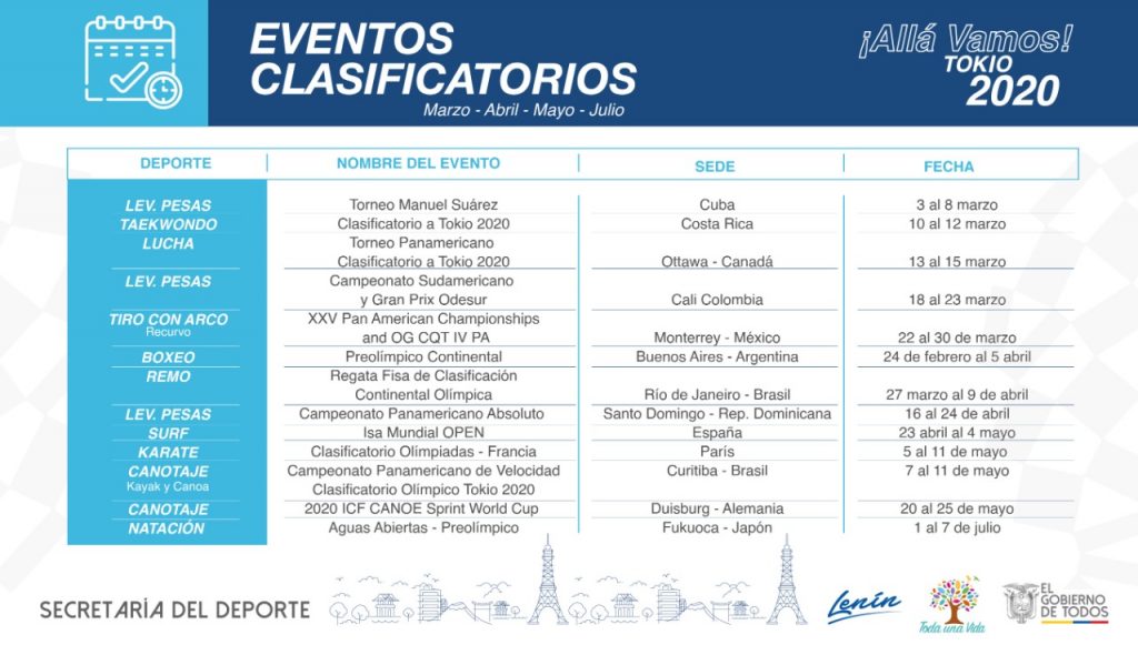 Marzo, abril y mayo serán meses de ritmo intenso para quienes buscan asegurar su presencia en Tokio. Levantamiento de pesas, taekwondo, lucha, tiro con arco, boxeo, remo, surf, karate, canotaje y natación, son disciplinas en las que Ecuador intentará clasificar el mayor número de deportistas.