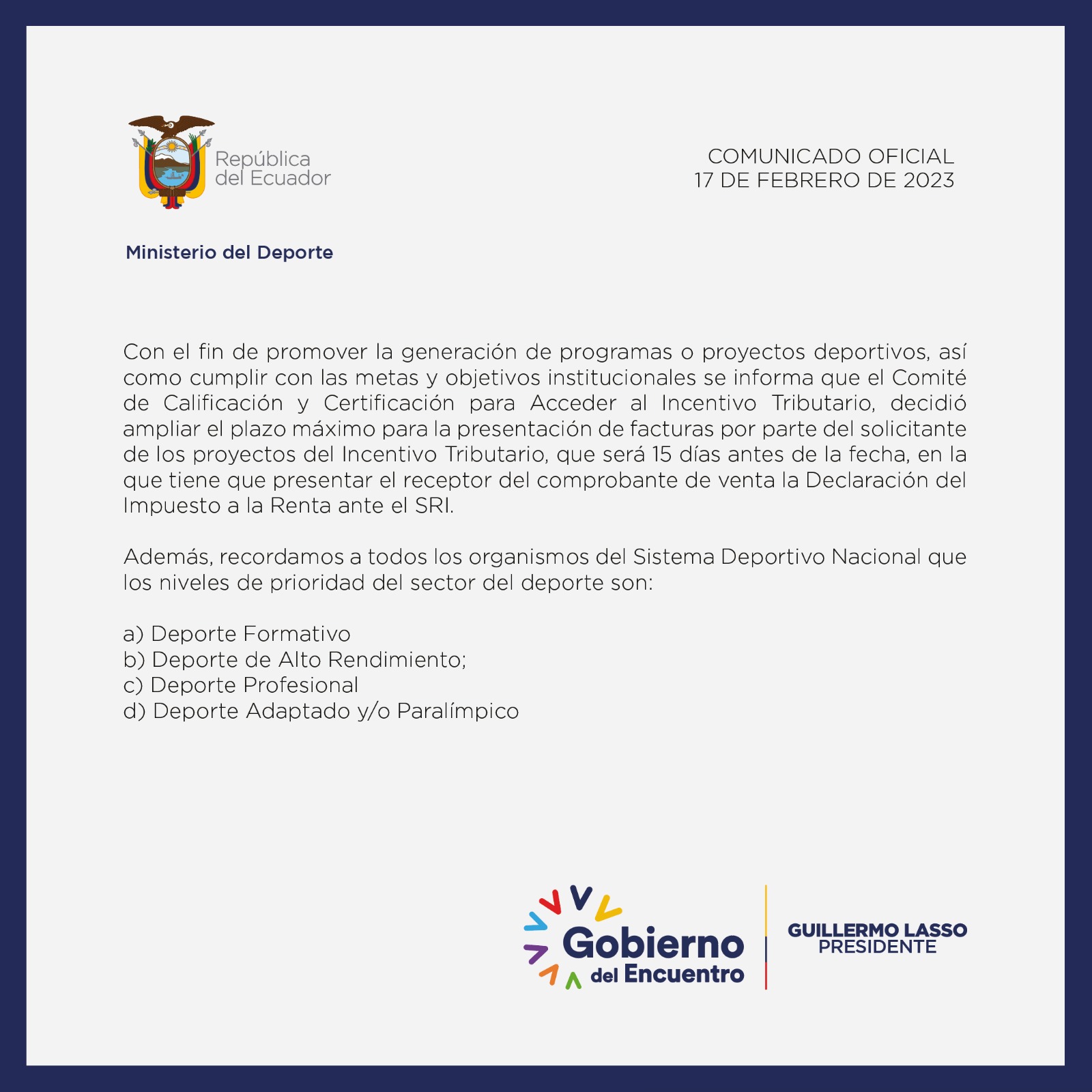> Comunicado del Incentivo Tributario