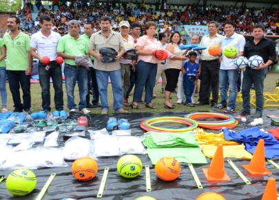 El Viceministro Gómez inició la entrega con un kit deportivo a la Unidad Educativa Paján e inmediatamente hizo lo propio con los artículos para la Liga Cantonal.