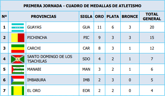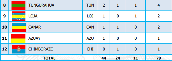 Fueron 23 de oro, 11 de plata y 6 de bronce las medallas conseguidas por el equipo albiceleste, dejando atrás a Pichincha con 17 de oro, 6 de plata y 5 de bronce y a Carchi con 14 doradas, 5 plateadas y 2 de bronce. Santo Domingo, Manabí, Imbabura, Tungurahua, El Oro, Loja, Azuay, Cañar, Esmeraldas, Cotopaxi y Chimborazo completaron el medallero, en ese orden.