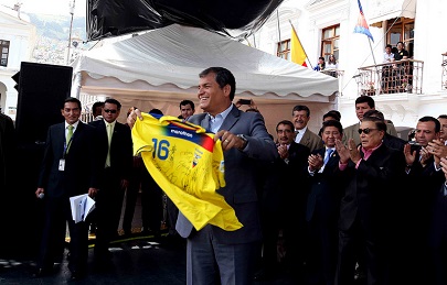 Por parte de los seleccionados y la Federación Ecuatoriana de Fútbol, su presidente, Luis Chiriboga, entregó una camiseta al Presidente autografiada por los jugadores que estuvieron presentes en este proceso que tendrá su punto cumbre el próximo año en Brasil.