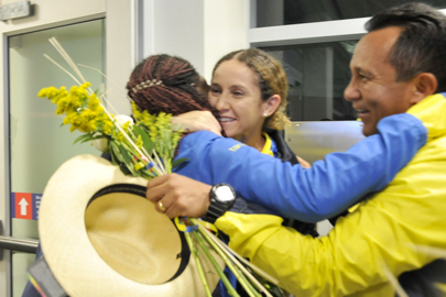 La ministra Vaca y sus acompañantes entregaron presentes a la delegación tricolor. Los abrazos, arengas y felicitaciones llenaron el ambiente de felicidad del aeropuerto.