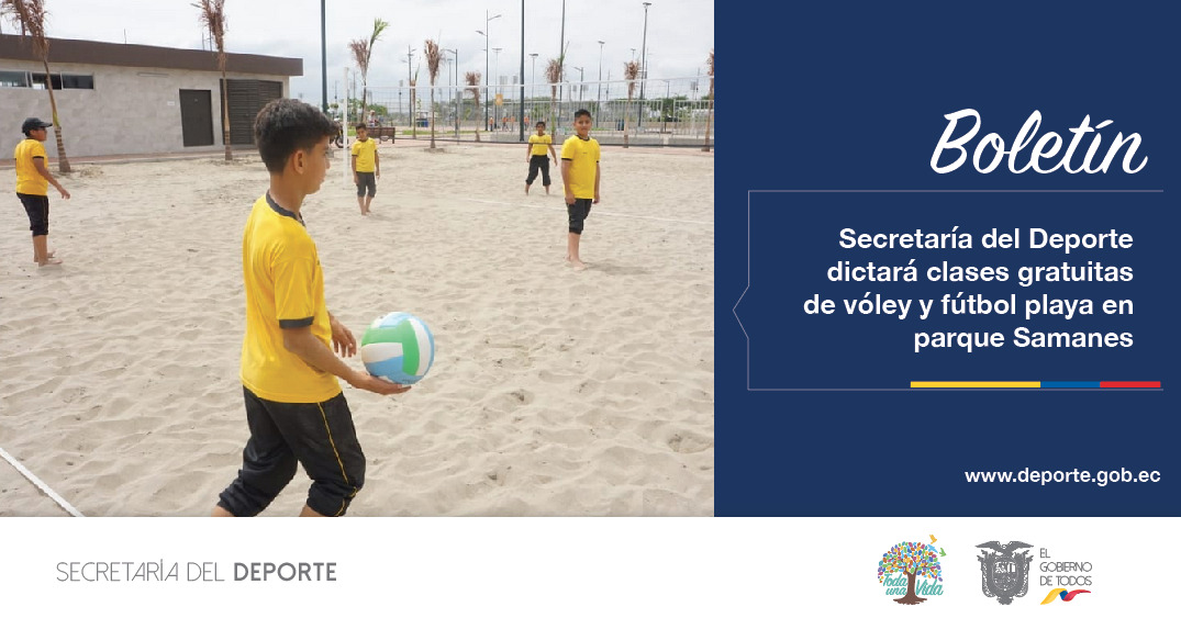 Guayaquil (Guayas). De lunes a viernes, a partir de las 14h30 hasta las 18h30, más de 200 niños, niñas y adolescentes se beneficiarán con las clases de voleibol y fútbol playa que la Secretaría del Deporte dictará gratuitamente en la fase Jacinta Sandiford del Parque Samanes, ubicado al norte de Guayaquil.