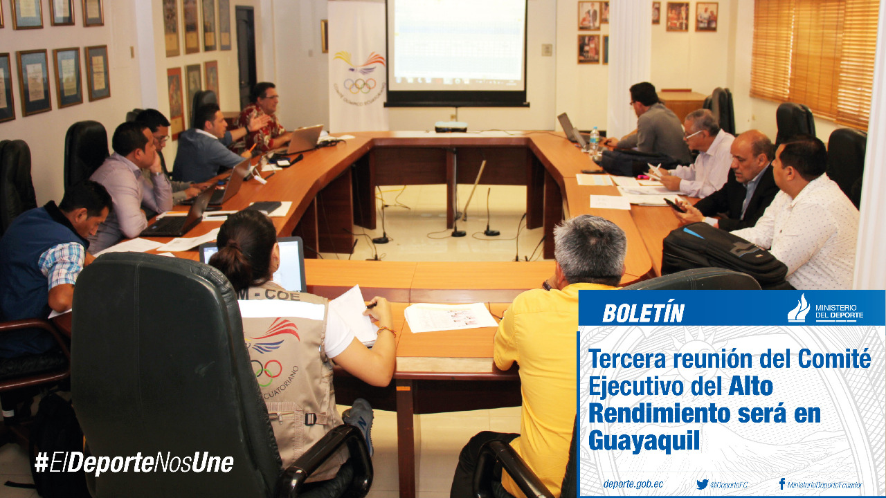 Quito (Pichincha).- El próximo lunes 14 de mayo se realizará la tercera reunión del Comité Ejecutivo del Alto Rendimiento, donde se tratarán siete puntos de interés deportivo, entre ellos, lo exclusión, inclusión y permanencia de los deportistas en el Plan de Alto Rendimiento, que dirige esta Cartera de Estado.